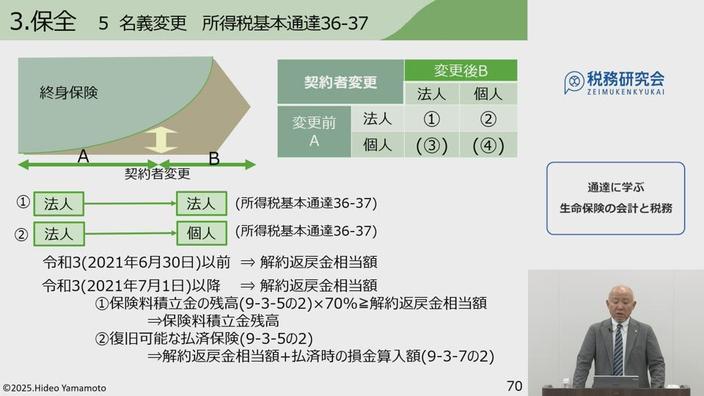 法人を契約者とした生命保険の経理処理については、昭和55年に発せられた法人税基本通達9-3-4から9-3-8を中心に考えられていました。その後はいわゆる「節税保険」と呼ばれる中小企業経営者向けの保険の税務上の取扱いを見直すため、商品ごとの個別通達で対応していましたが、令和元年6月に法人税基本通達の一部改正で抜本的な改正が行われました。また、令和3年6月の所得税基本通達改正により、法人個人間の名義変更の際の評価方法が改正されました。最近の保険商品、その契約形態・保全方法などでの経理処理のしかたについて、最新の状況を踏まえ確認しておくべきものを解説させていただきます。